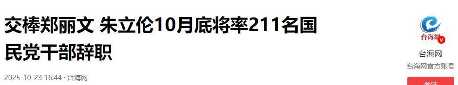 台湾网:《交棒郑丽文 朱立伦10月底将率211名国民党干部辞职》,2025-10-23