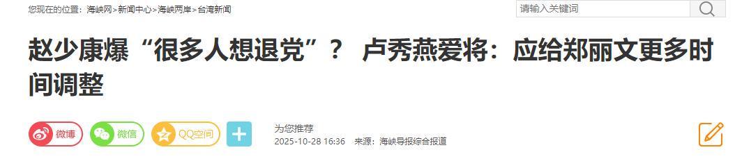 海峡网:《赵少康爆“很多人想退党”? 卢秀燕爱将:应给郑丽文更多时间调整》,2025-10-28