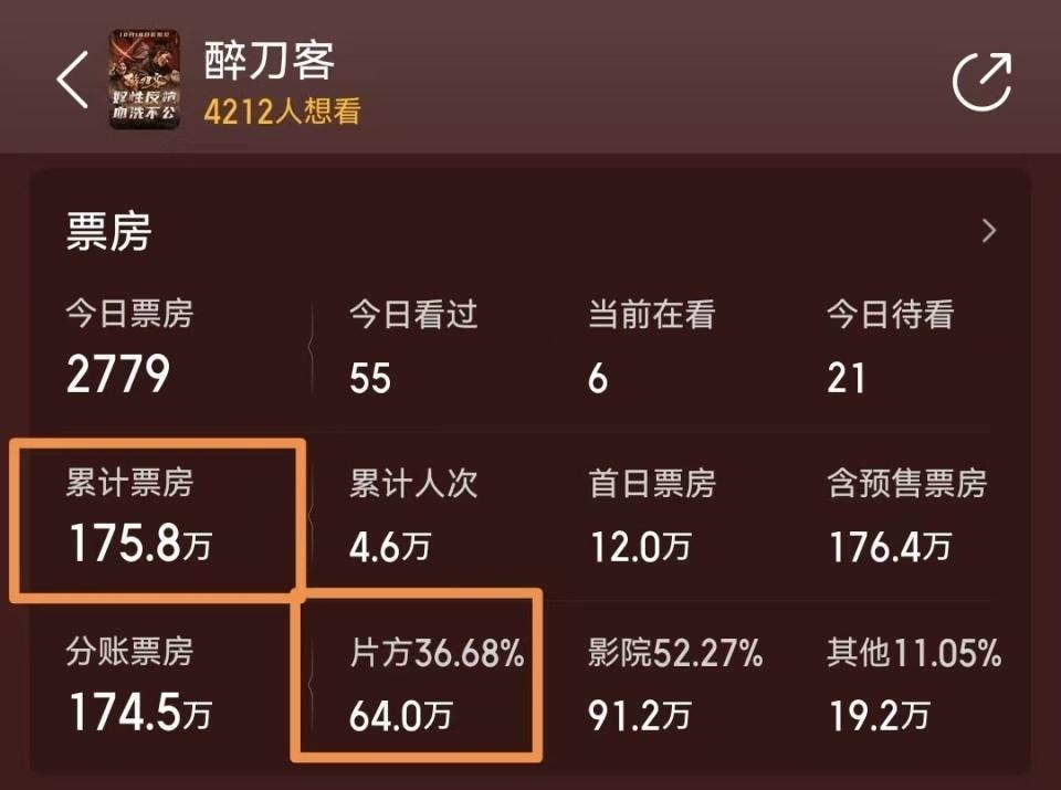 但现实很残酷,《醉刀客》目前的院线票房为175万,其分账票房出炉,片方将回收64万,下映之后卖给流媒体还有几百万,此片会给制片方带来1000多万亏损。