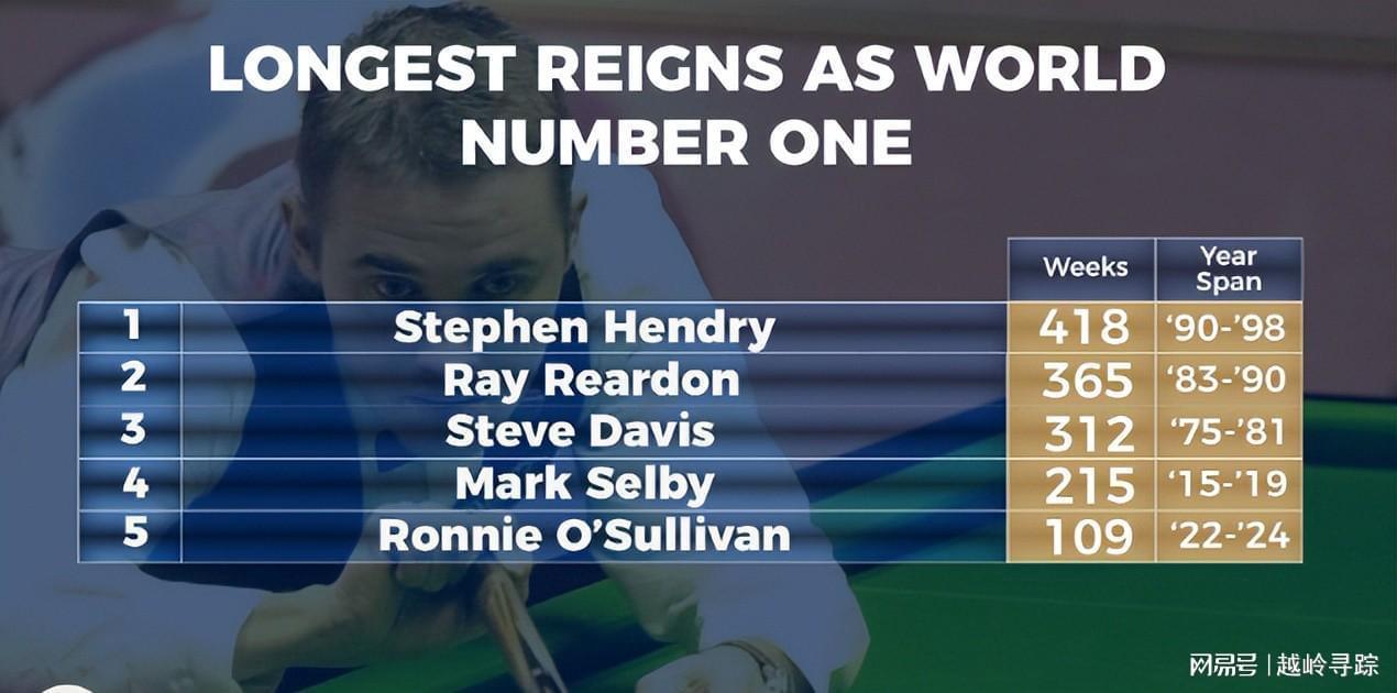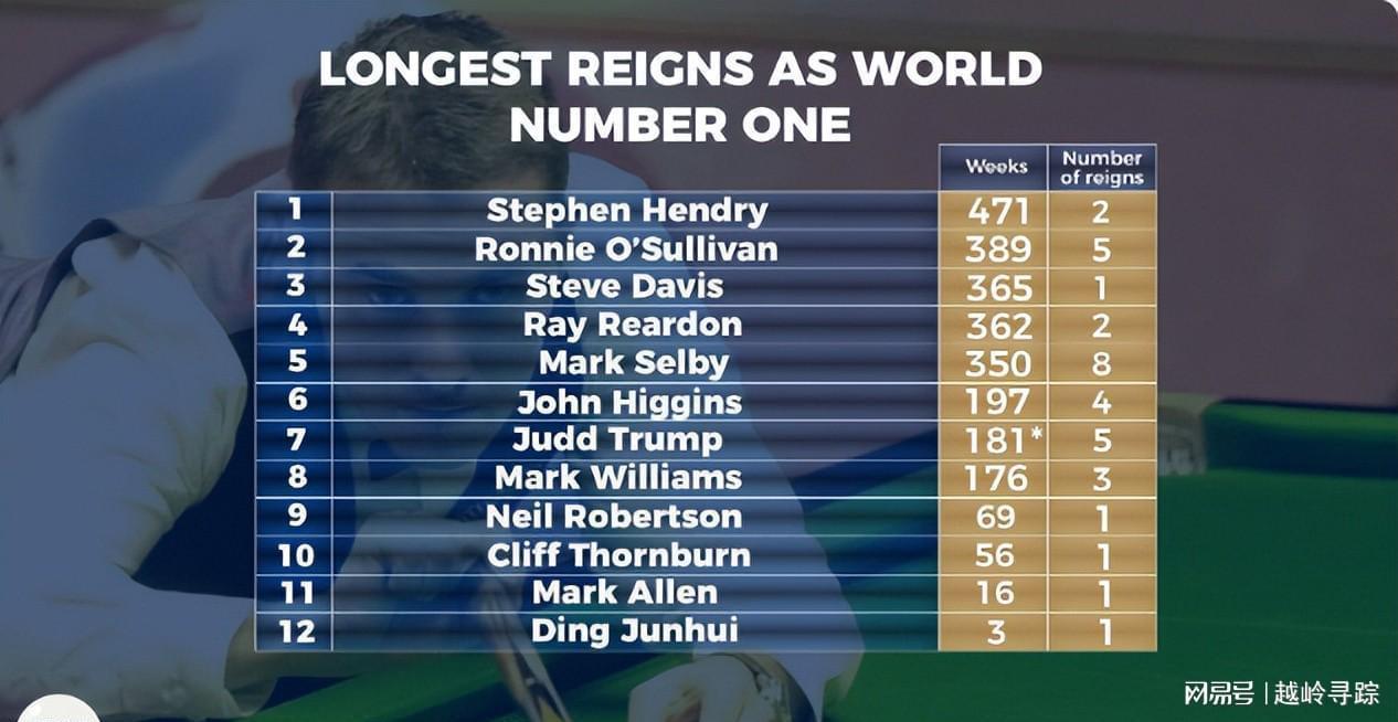 “台球皇帝”亨德利以471周的霸榜时长独占鳌头,“火箭”奥沙利文则以389周紧随其后。