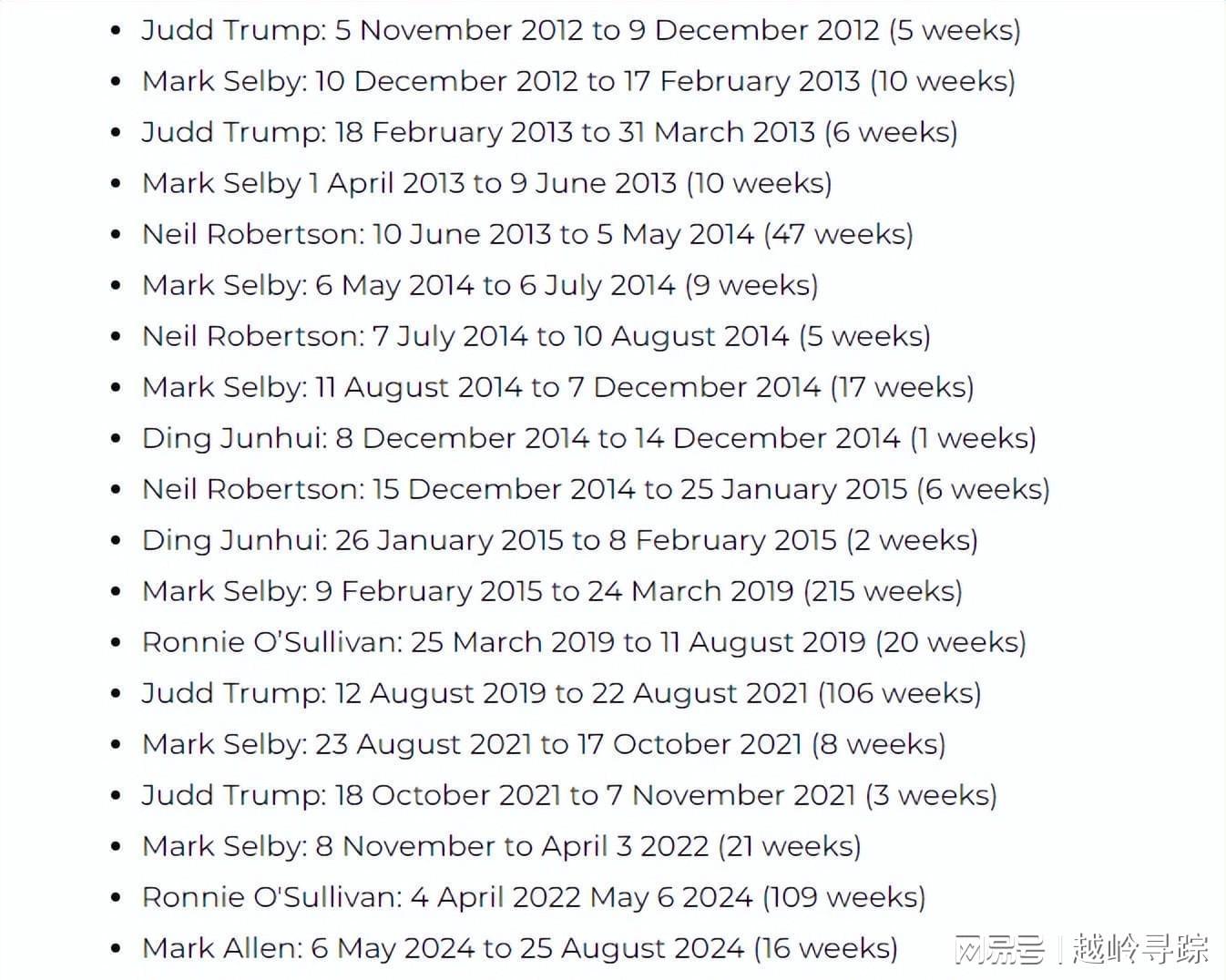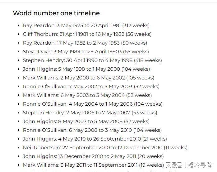 斯诺克世界第一历史榜单,记录了每一位球员的辉煌时刻。