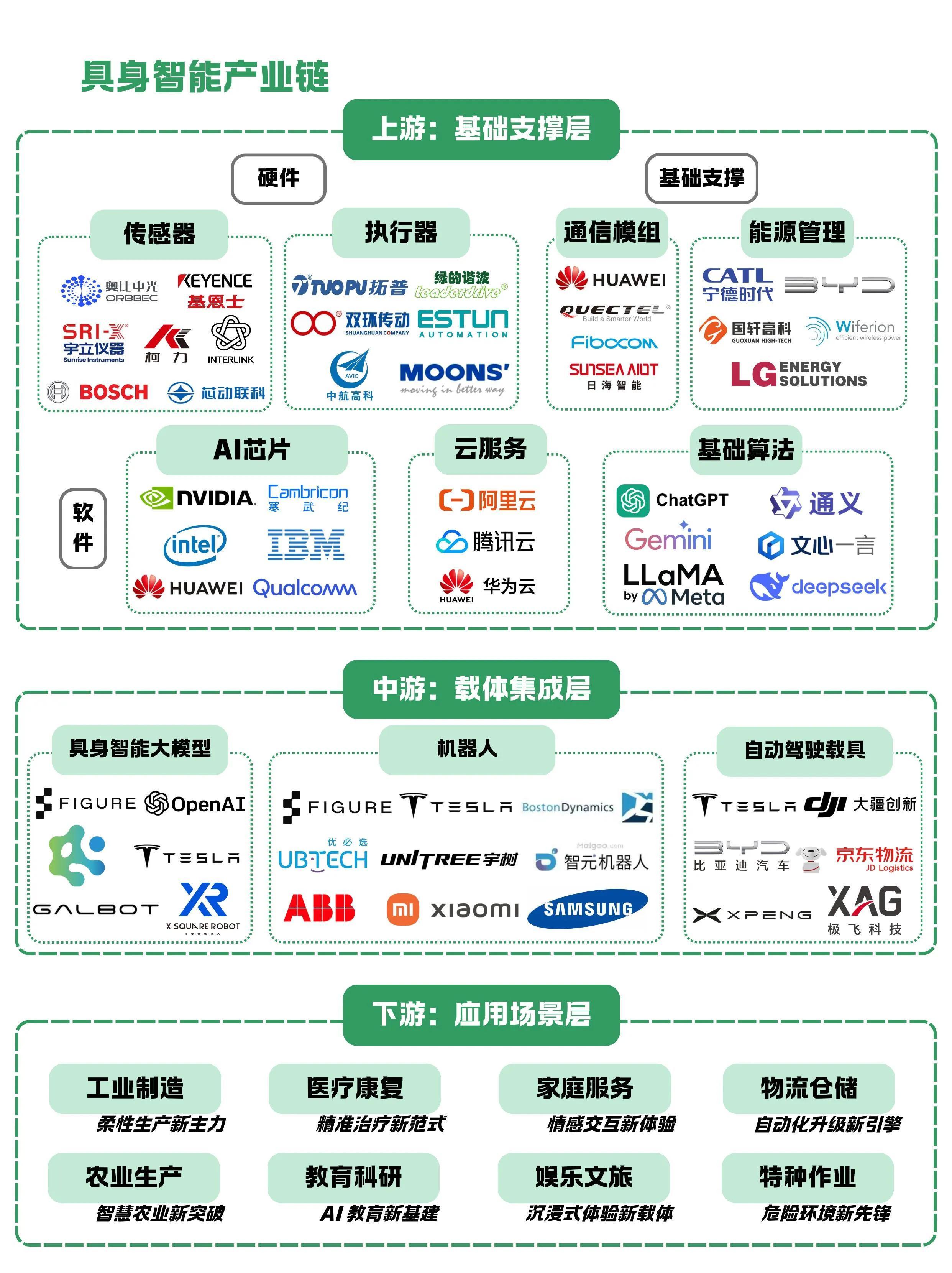 最后,还要提到大家非常陌生的具身智能产业。这个行业主要是将AI技术赋予物理身体,使其能与我们生活的世界进行交互和学习,有望在工业、养老、医疗、家庭等诸多领域带来变革。比我们看到的工业机器人还要高级,比现在的人形机器人更先进。因此,这就需要非常高的算法和模拟能力,这也是国外AI研究的重点方向。