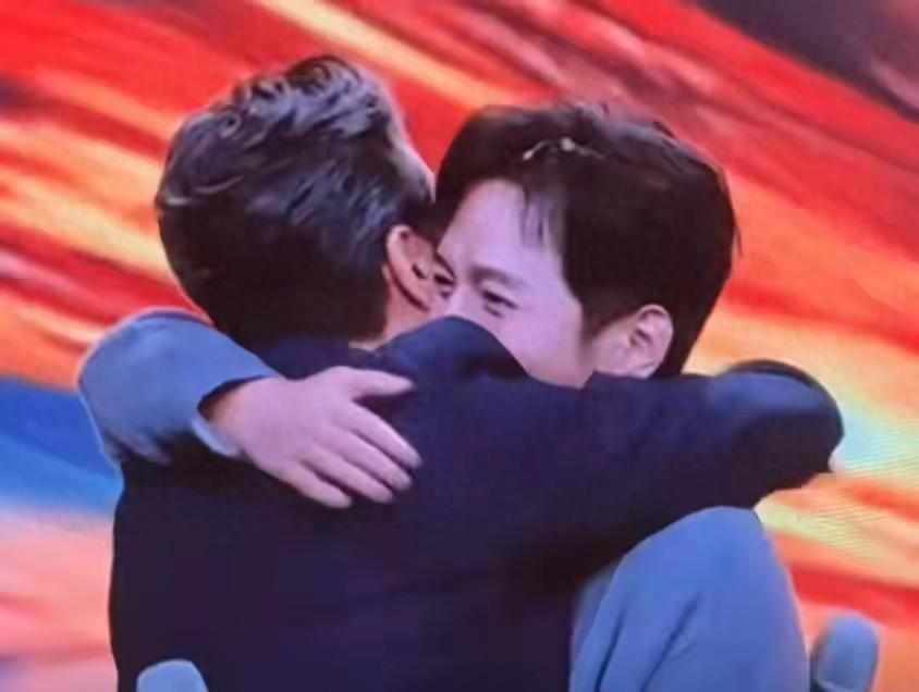 他眼含热泪地先后与何炅、汪涵他们紧紧相拥。