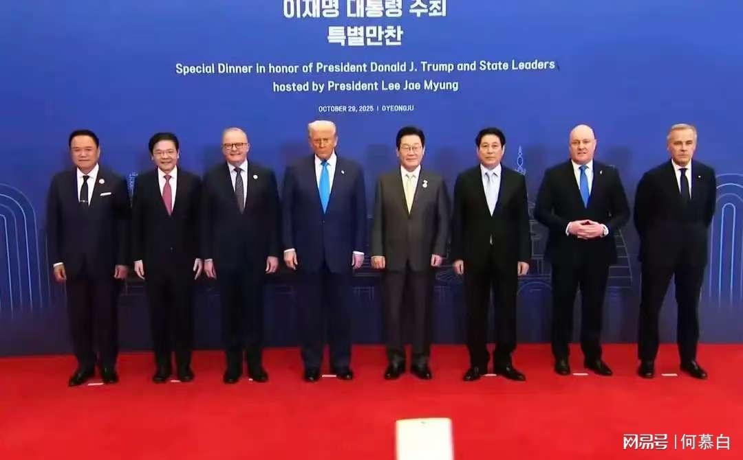 泰国副总理阿努廷的现身颇具戏剧性。此前他因国内事务一度表示无法出席,最终仍赶赴庆州。晚宴合影环节,8位代表站成一排:阿努廷居最左侧,依次为新加坡财政部长黄循财、澳大利亚总理阿尔巴尼斯、美国总统、韩国总统李在明、越南总理梁强、新西兰总理卢克森及加拿大总理卡尼。