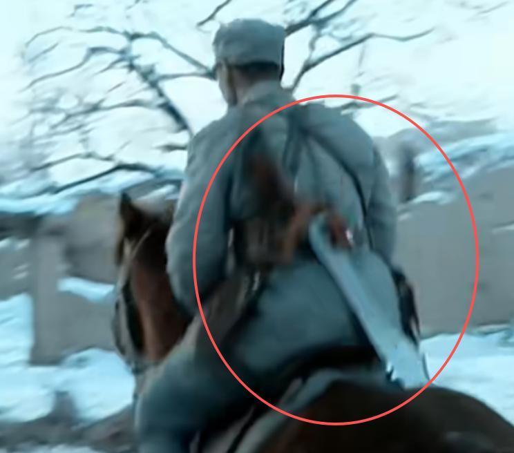 在魏和尚送信的片段中,他跟段鹏告别后,骑上马前往师部。镜头中,他出发时背了一把大砍刀。