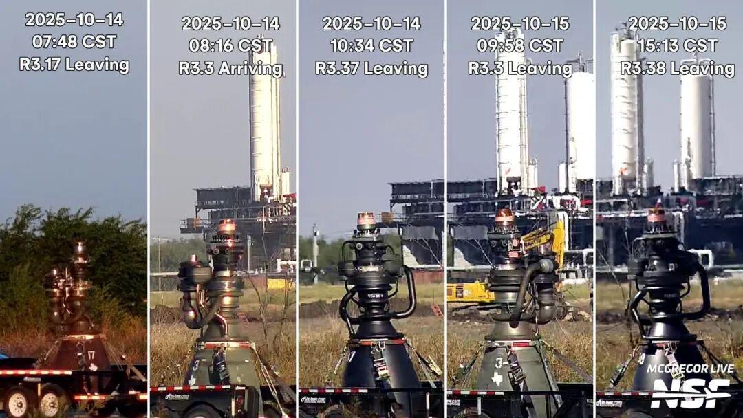 X平台用户@SpaceRhin0记录的运输动态显示,麦格雷戈测试场在两天内完成5台猛禽3号发动机的调度:1台编号R3.3的发动机抵达测试区,4台(R3.17、R3.37、R3.3、R3.38)完成测试后离开。这种高频调度模式,反映出SpaceX对猛禽3号发动机的测试节奏已进入量产前冲刺阶段。