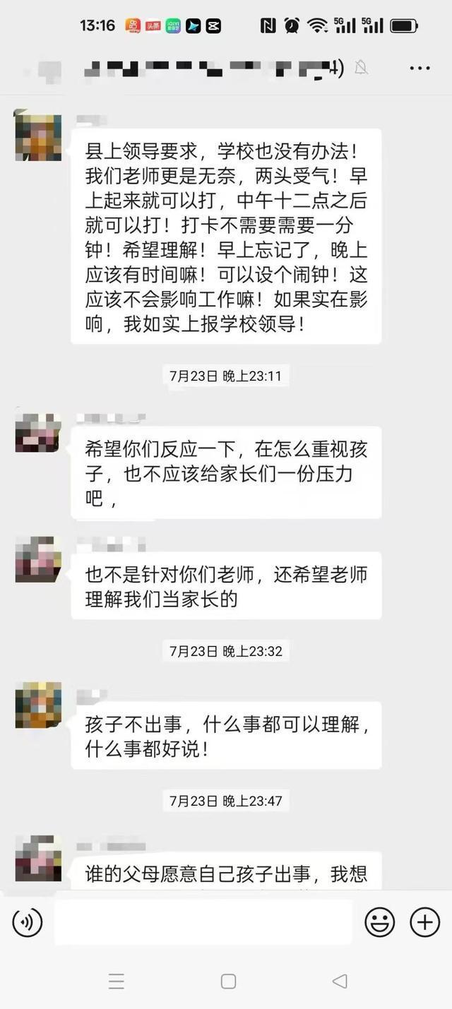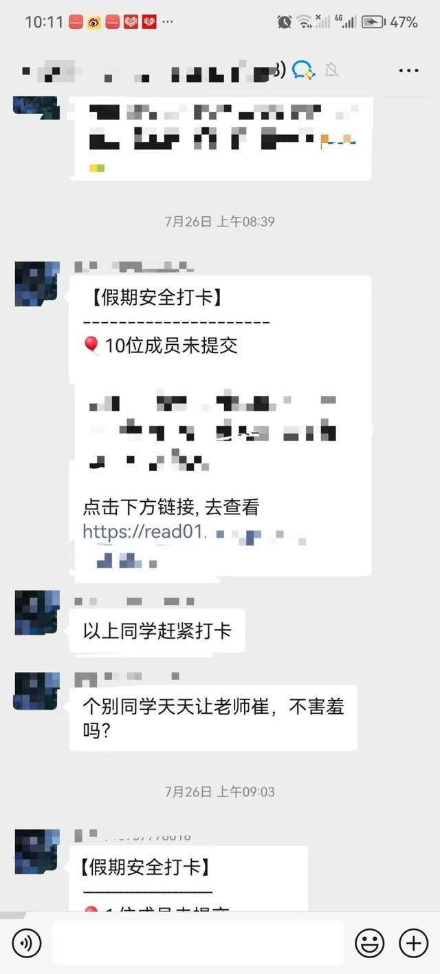 我有3个孩子,分别上小学和幼儿园。今年7月1日,上小学的孩子放暑假,学校要求家长每天在凌晨0时至上午10时、中午12时和晚8时进行两次打卡。7月10日,另一孩子放暑假,学校也如此要求。不打卡老师就会在群里@家长,甚至打电话催。但实际上,学生放假当天,学校已组织家长到校开家长会,告知了暑期安全注意事项。