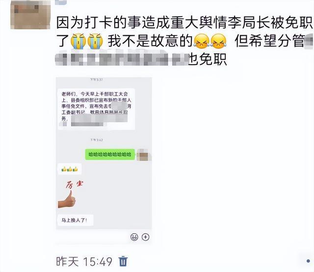高光华朋友圈发文截图显示,9月1日下午3时49分,高光华朋友圈发文称“因为打卡的事造成重大舆情李局长被免职了(大哭表情)我不是故意的(哭泣表情)但希望分管教体和文旅的杨副县长也免职。”