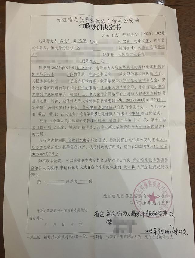 《行政处罚决定书》显示,高光华在未经查证李局长被免职的真实原因情况下,捏造事实称其系“打卡”事件造成重大舆情被免职,并将捏造事实的信息发布到微信上,多人对该信息点赞、评论,致使他人的人格权和名誉权遭到损害。以上事实有书证、物证、证人证言、检查笔录及违法嫌疑人的陈述和申辩等证据证实。决定给予高光华诽谤的行为处行政拘留4日的处罚。