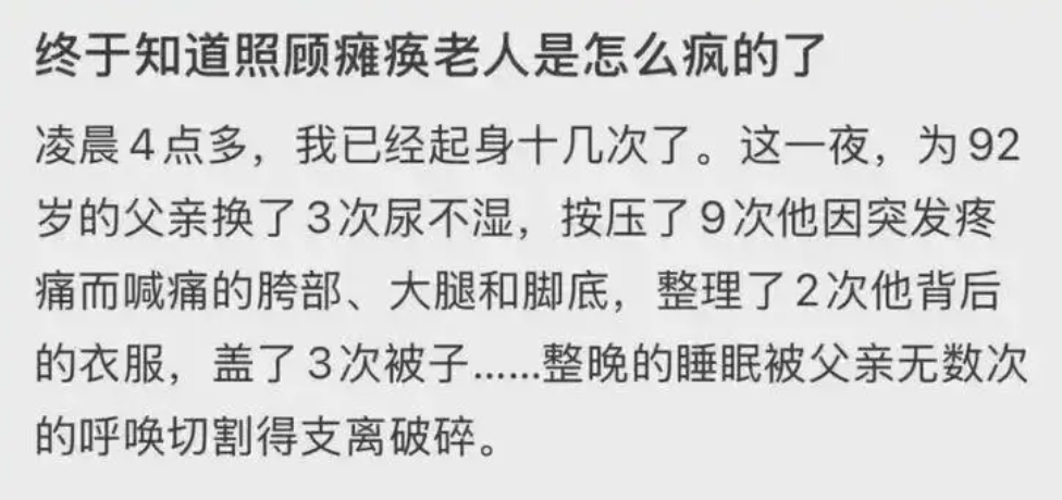 普通家庭的困境同样触目惊心。笔者一位亲戚的老人十年前因重度脑梗失能,需24小时照料:翻身、换尿布、喂饭、递水……子女尚未退休时,只能雇佣保姆与老伴共同照顾。但随着老伴接连患上甲状腺癌与肺癌,家庭负担骤增。子女们一边照顾父母,一边兼顾自己的小家,最终老伴在肺部手术后一年多离世,而失能的老太太却依然'能吃能喝'。