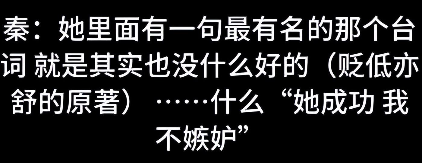 说完陈道明,秦雯又开始说《流金岁月》的女主刘诗诗,爆料刘诗诗的粉丝曾在微博艾特她,说她把原著蒋南孙(刘诗诗饰)最有名的一段台词,给了朱锁锁(倪妮饰)。