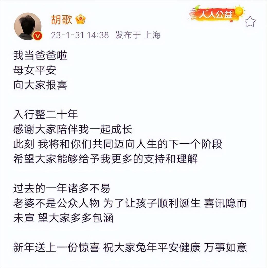 23年,胡歌在微博中官宣自己当爸爸了,并且称其老婆为圈外人。
