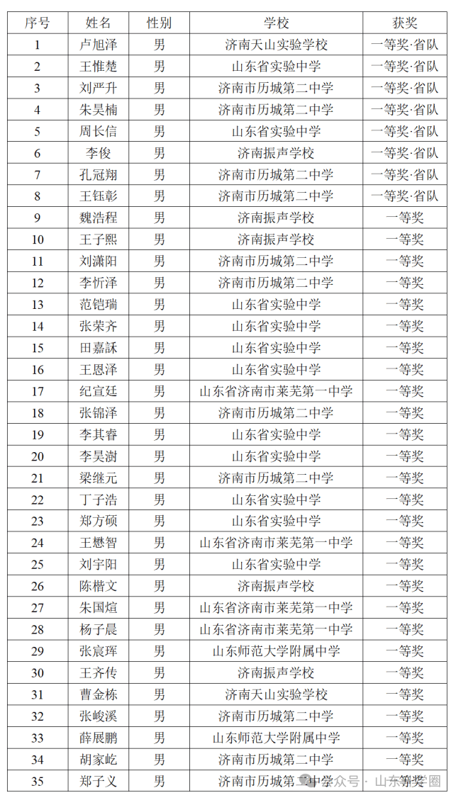本届数学奥林匹克竞赛(预赛)共产生一等奖90人,其中19人入选山东省集训队。济南市学子表现尤为突出,共有35人获一等奖,8人入选省集训队,两项数据均位居全省第一。