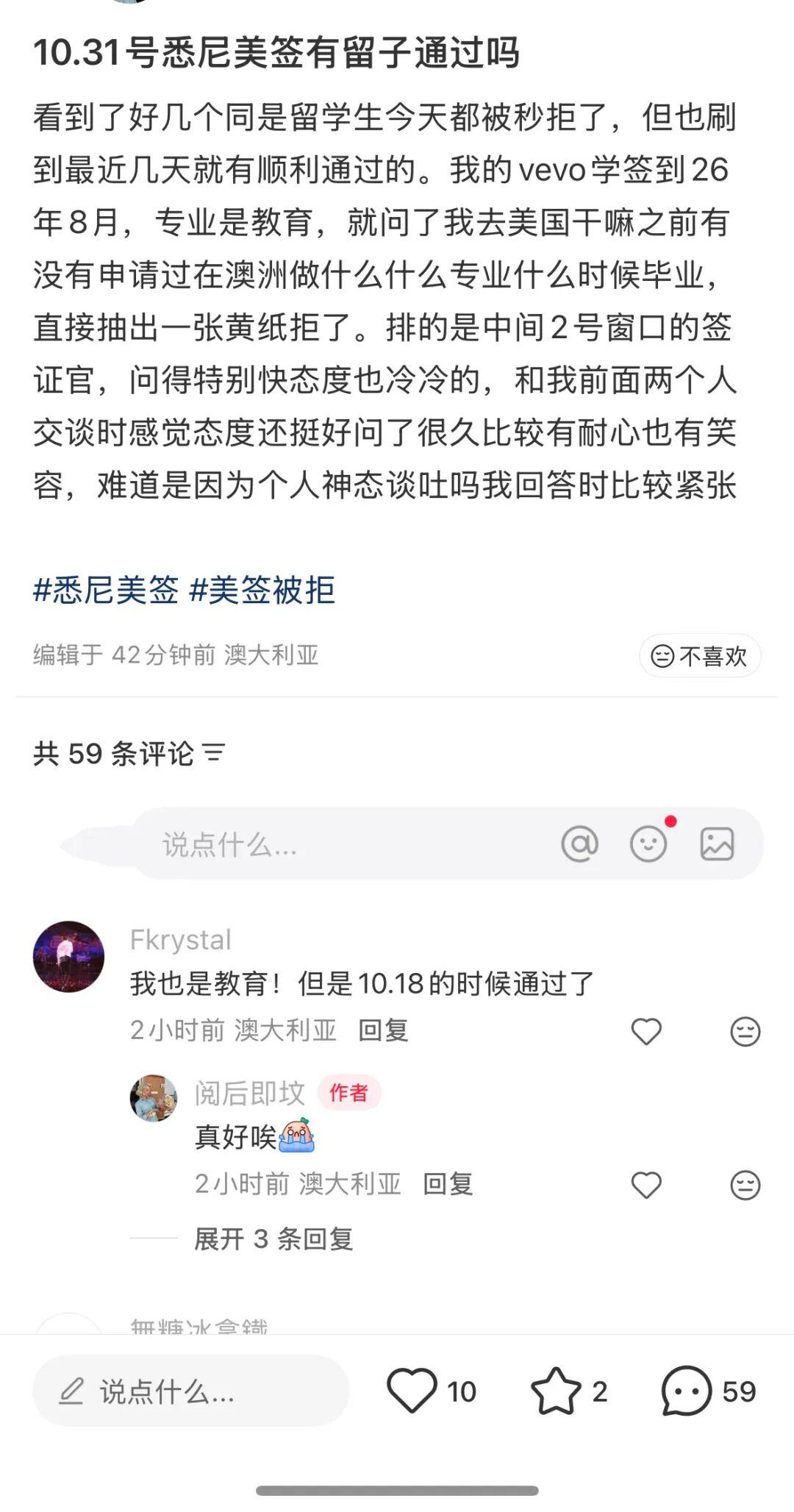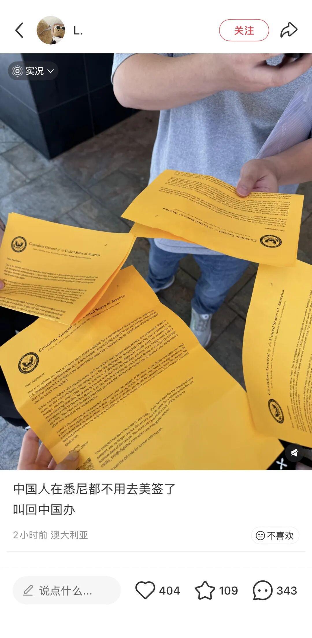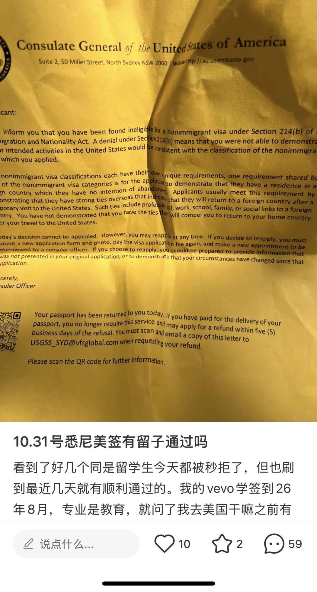 今天就刚刚,在悉尼、墨尔本等地申请美国签证的中国学生,接连在社交媒体上发帖:面签被拒,理由却几乎一致——“建议回中国申请”。