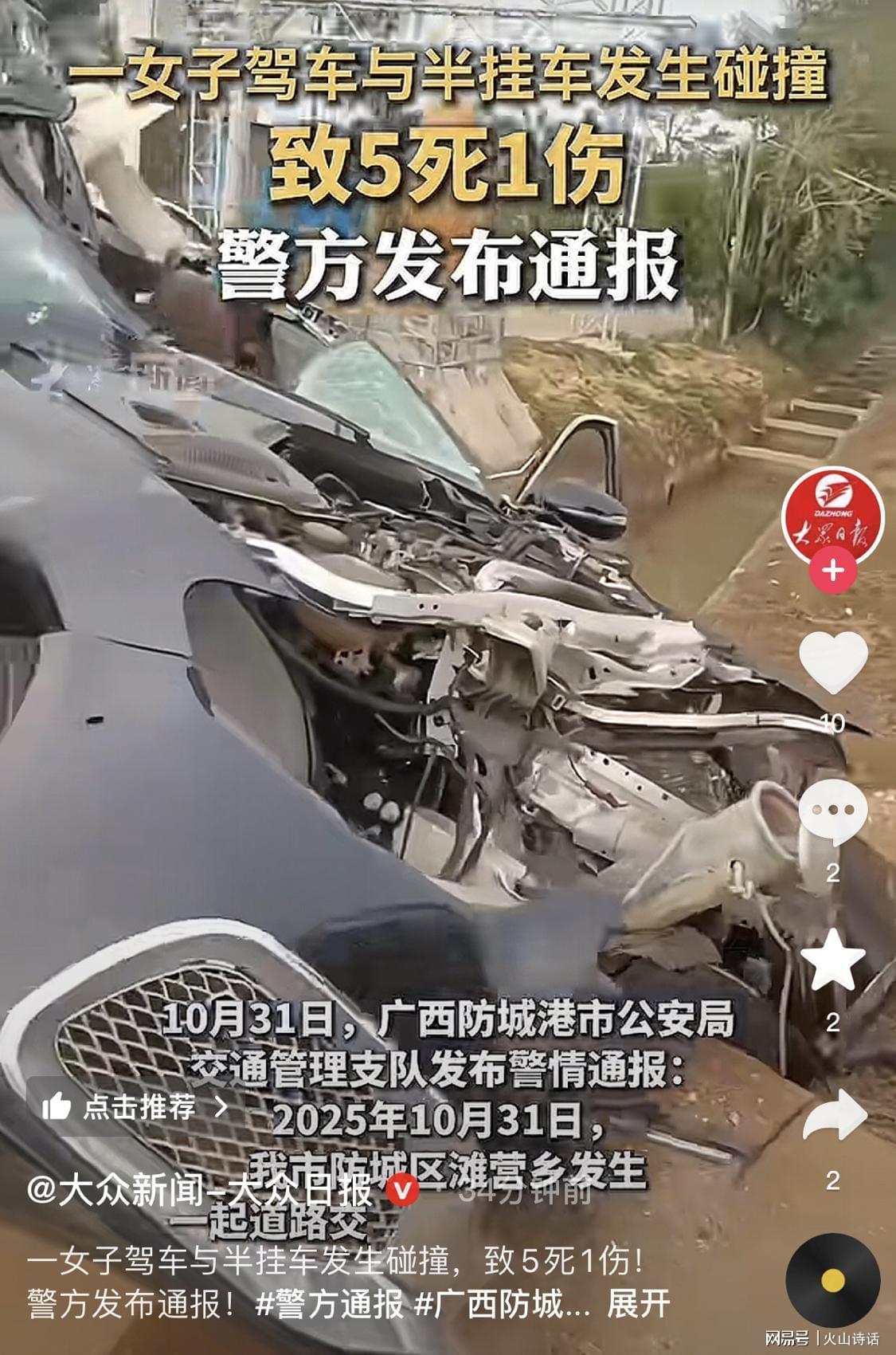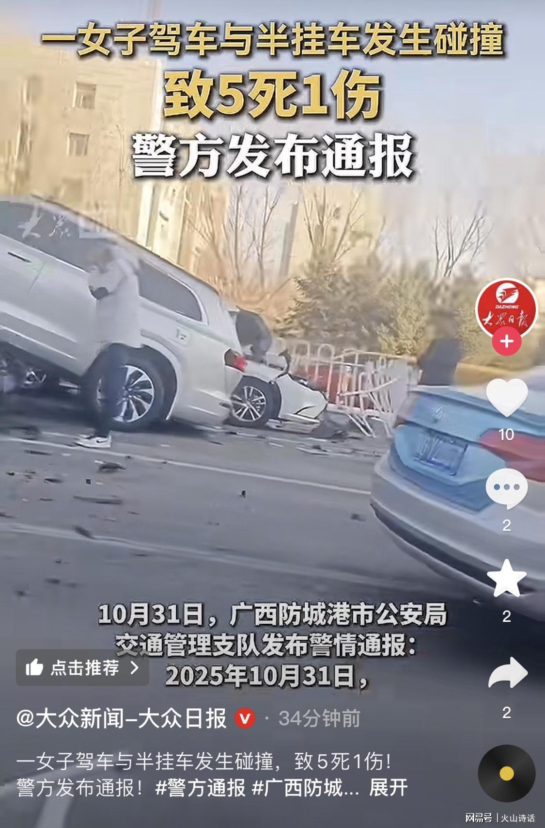 10月31日,防城港市公安局交通管理支队发布了警情通报,详细披露了事故经过:
