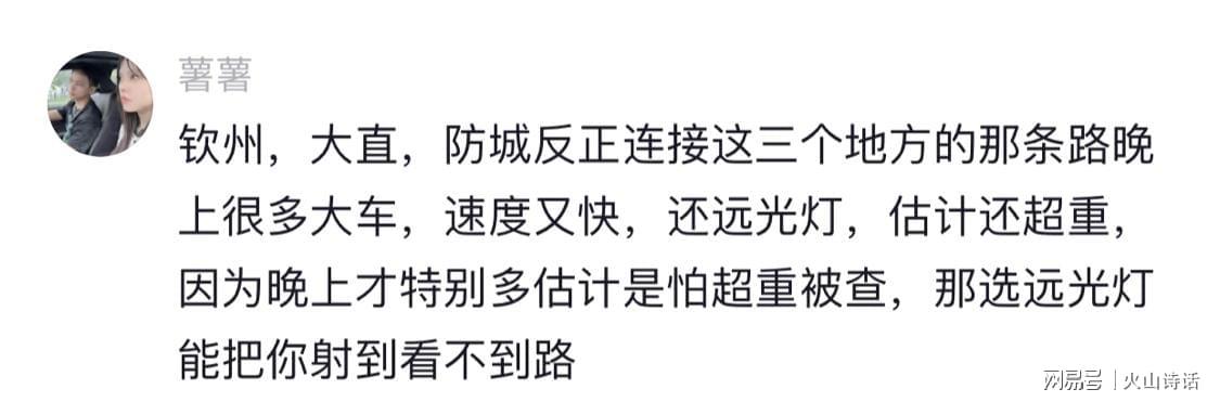 网友@薯薯 则表示:“钦州、大直、防城连接的路晚上很多大车,速度又快,还开远光灯,估计还超重,晚上特别多,可能是怕超重被查。”