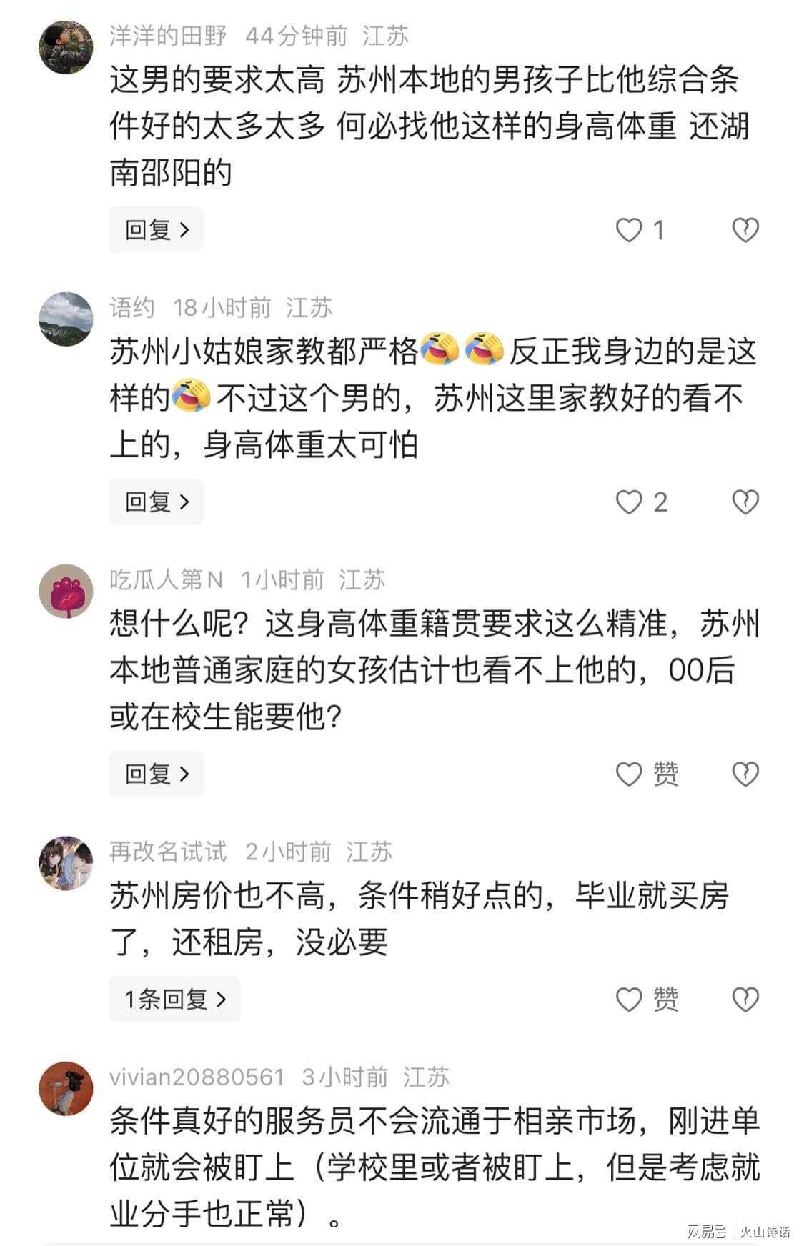 对于这一征婚条件,有网友表示,该男子的要求似乎过高。在苏州本地,综合条件比他好的男孩子大有人在,何必非要选择一个身高体重、籍贯(湖南邵阳)都如此具体的对象呢?