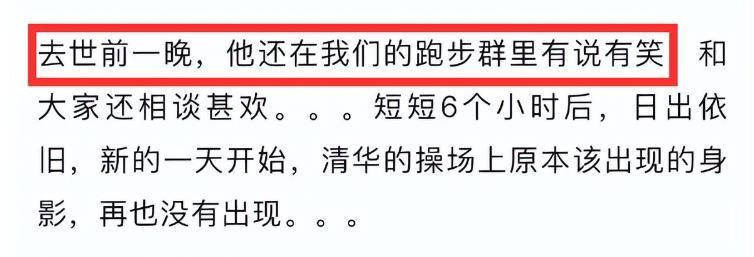 去世前一天,他像往常一样早上五点半到达清华操场,跑了五公里,回来还在群里发了张操场的照片,配文‘今天天气好,适合跑步’。