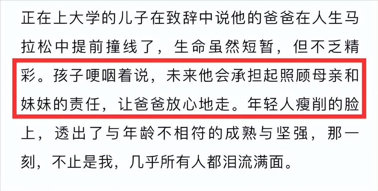 在家里,他是女儿家长会的常客,儿子高考时每天早上先陪儿子背单词,再去操场晨跑。一双儿女被教得懂事贴心,这次他的后事,都是刚上大学的儿子一肩挑起。