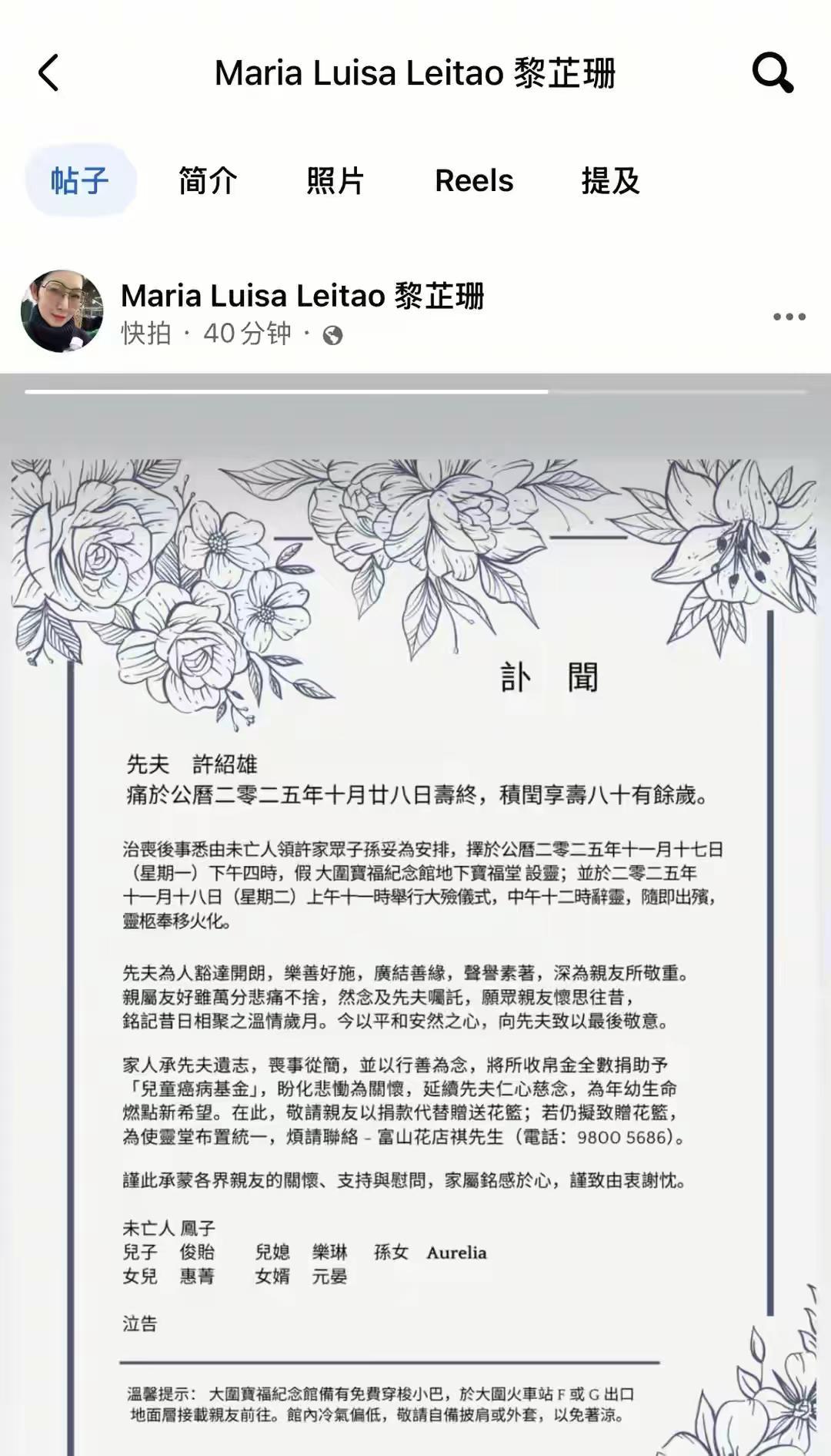 值得一提的是,家属在讣告中特别提出,希望送花篮的亲友能够直接捐赠款项。这些善款将与帛金一起,全数捐给儿童癌病基金,为那些正在与病魔抗争的年幼生命点燃希望之火。这一善举,无疑是对许绍雄生前善良品质的最好延续。