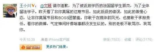 可惜没过多久,文颐就因为当众质疑一名法国留学生的硕士学历是“技术专科学校”而饱受争议。甚至还引起了李开复的关注,使其在网上发起网络投票,公开抵制《非你莫属》。