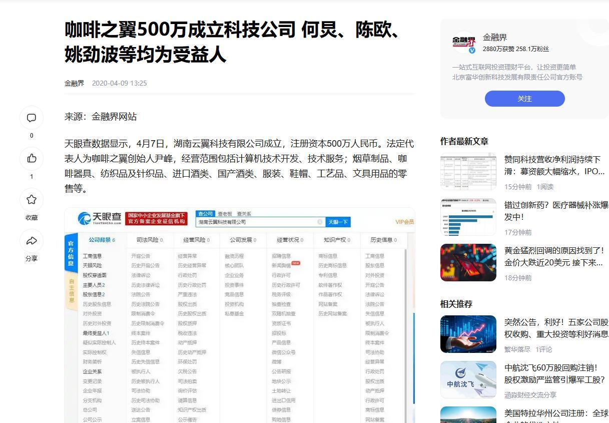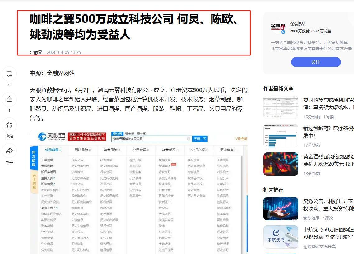 金融界,咖啡之翼500万成立科技公司 何炅、陈欧、姚劲波等均为受益人