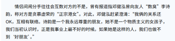 尤其两人明明是和平分手,港媒却写李施嬅 “狠踹邓健泓”,又写她 “正宗港女(贪慕虚荣)”,哪怕邓健泓都主动替她澄清,李施嬅却依然被扣上“物质”的帽子。