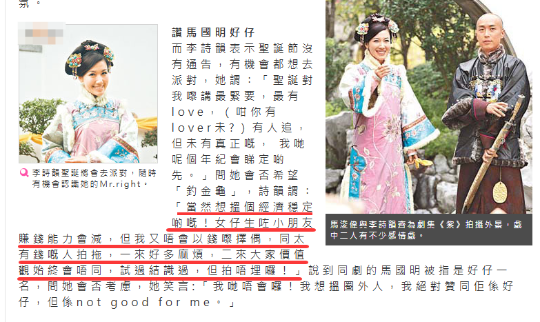 被“钓金龟”新闻缠身的几年,她曾明确回应,自己当然想找经济稳定的对象,但不会用钱来择偶,觉得和太有钱的人拍拖,一来很麻烦,二来价值观不同,“not good for me”。