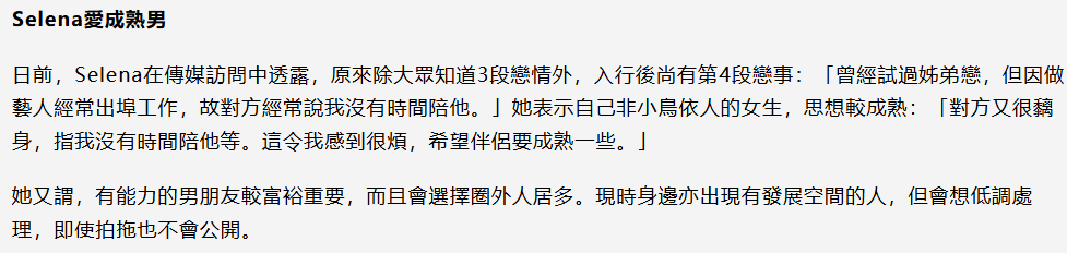 此外,她还和圈外“年下男”拍拖过,但对方很黏,经常埋怨没时间陪伴,让她觉得很烦,所以她想找年纪比自己大,成熟的另一半。