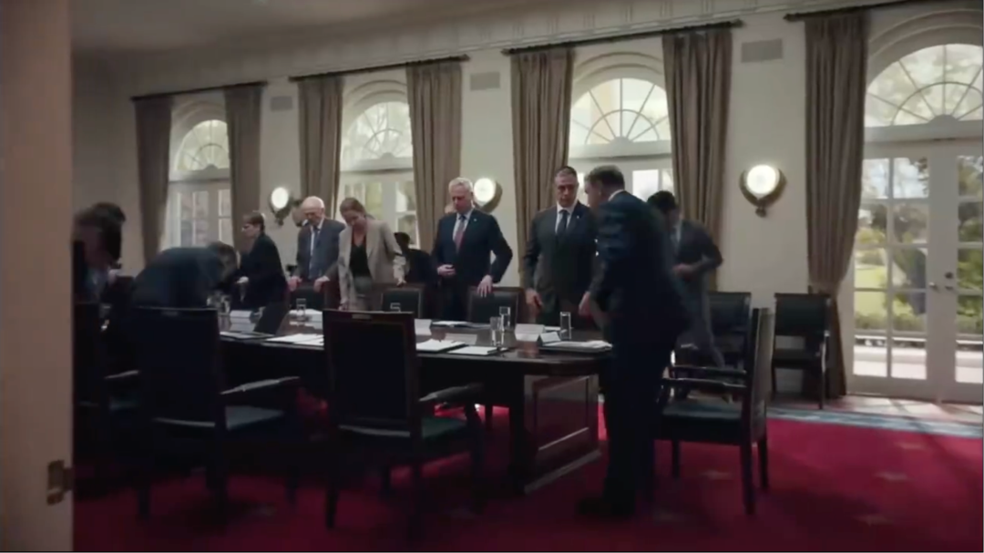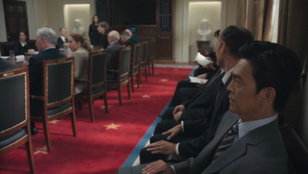 争议最大的画面出现在一场国际高层阴谋会议中,会议室地毯采用红色底色配黄色五角星的设计,被解读为暗示“中国国旗被全球踩在脚下”,并暗示中国是阴谋策划者。这种极具象征意义的场景设置,直接触碰了中国观众的敏感神经。