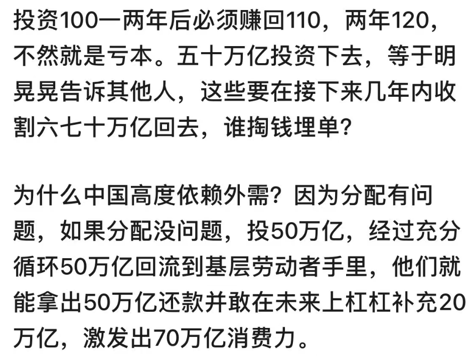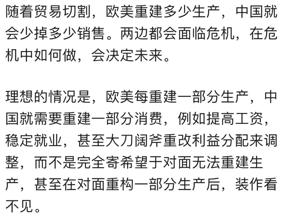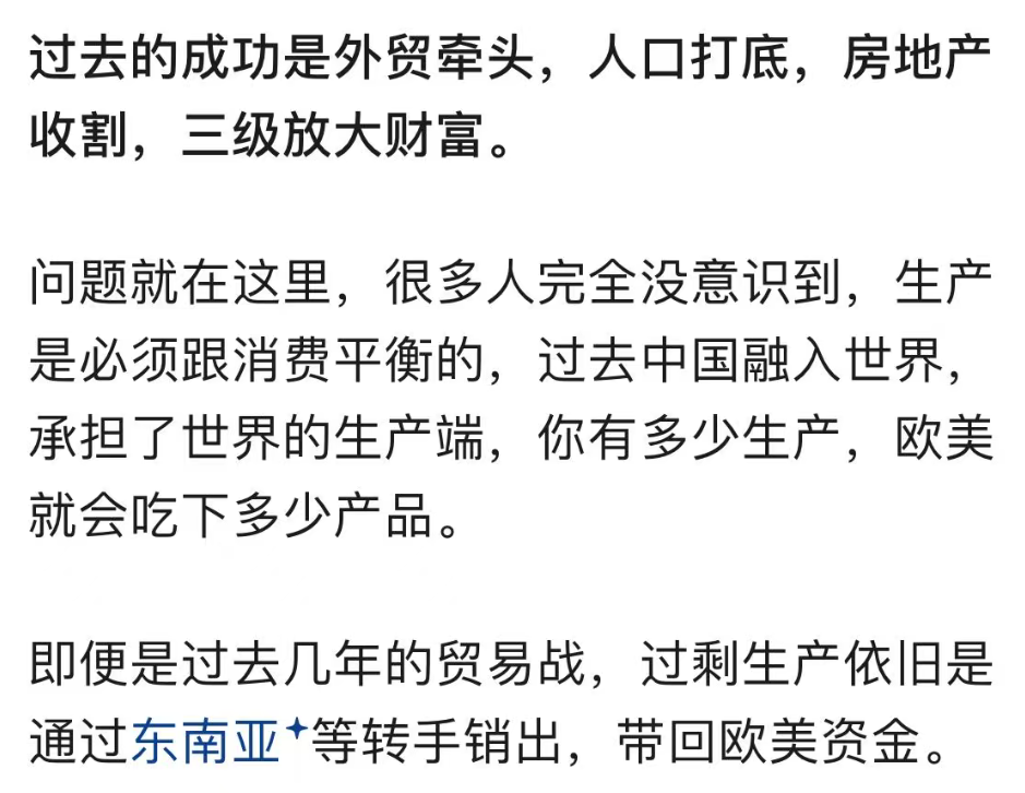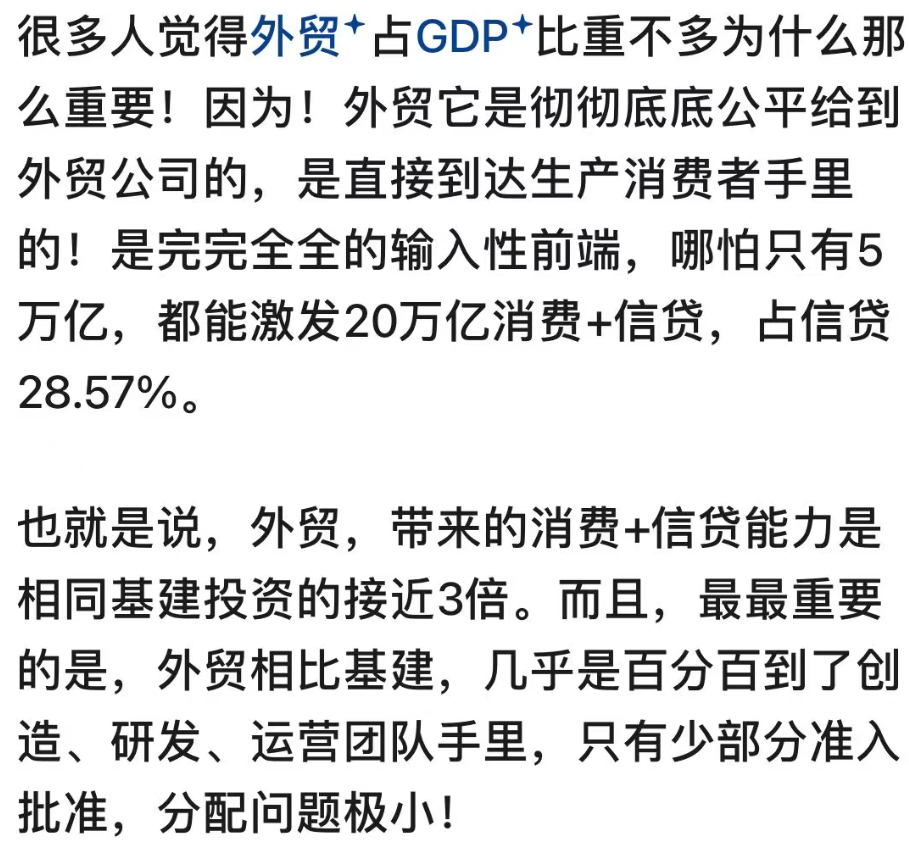他特别指出,外贸对经济流动性的贡献不可忽视。若失去外贸带来的资金循环,经济将如一潭死水,失去活力。