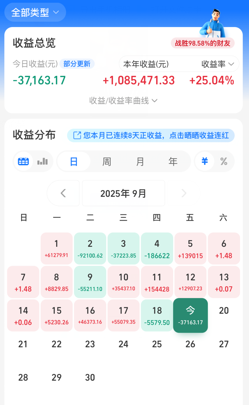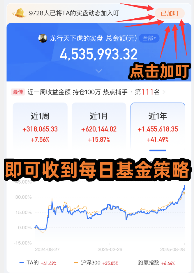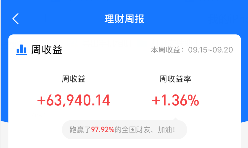 先聊聊个人近况,大龙最近可是忙得不可开交,凌晨6点就跟着亲戚去接亲了。不过,再忙也没忘记关注A股的动态。周四周五A股连续下跌两天,不少投资者表示,9月的盈利都快亏完了。但大龙认为,这有点夸张了。毕竟,从整体来看,9月A股还是上涨的。大龙上周总体盈利了6.4万,9月总体盈利快11万。只能说,方向选对了,跟上的朋友这个月肯定都是吃肉的。