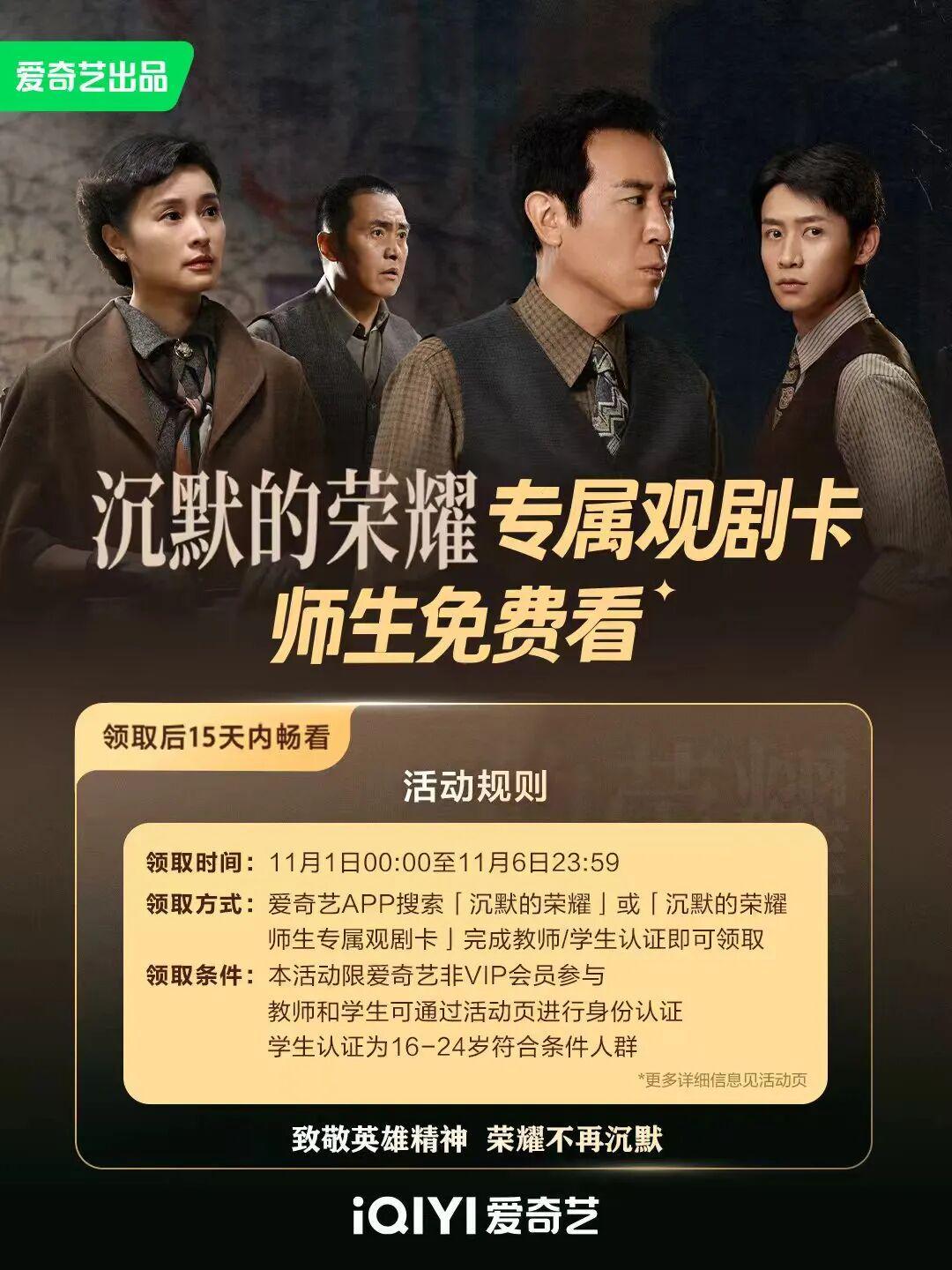 由爱奇艺独家出品的致敬隐蔽战线英烈的剧集《沉默的荣耀》,自9月30日开播以来迅速成为现象级作品。剧中"若一去不回,便一去不回"等铿锵誓言,配合真实还原的隐蔽斗争场景,在观众中引发强烈共鸣。为回馈社会关注,11月1日爱奇艺宣布推出专项福利:11月1日至11月6日期间,教师及16-24岁学生群体通过爱奇艺App搜索"沉默的荣耀"或"沉默的荣耀师生专属观剧卡"进入活动专区,完成身份认证后即可免费观看全剧内容。