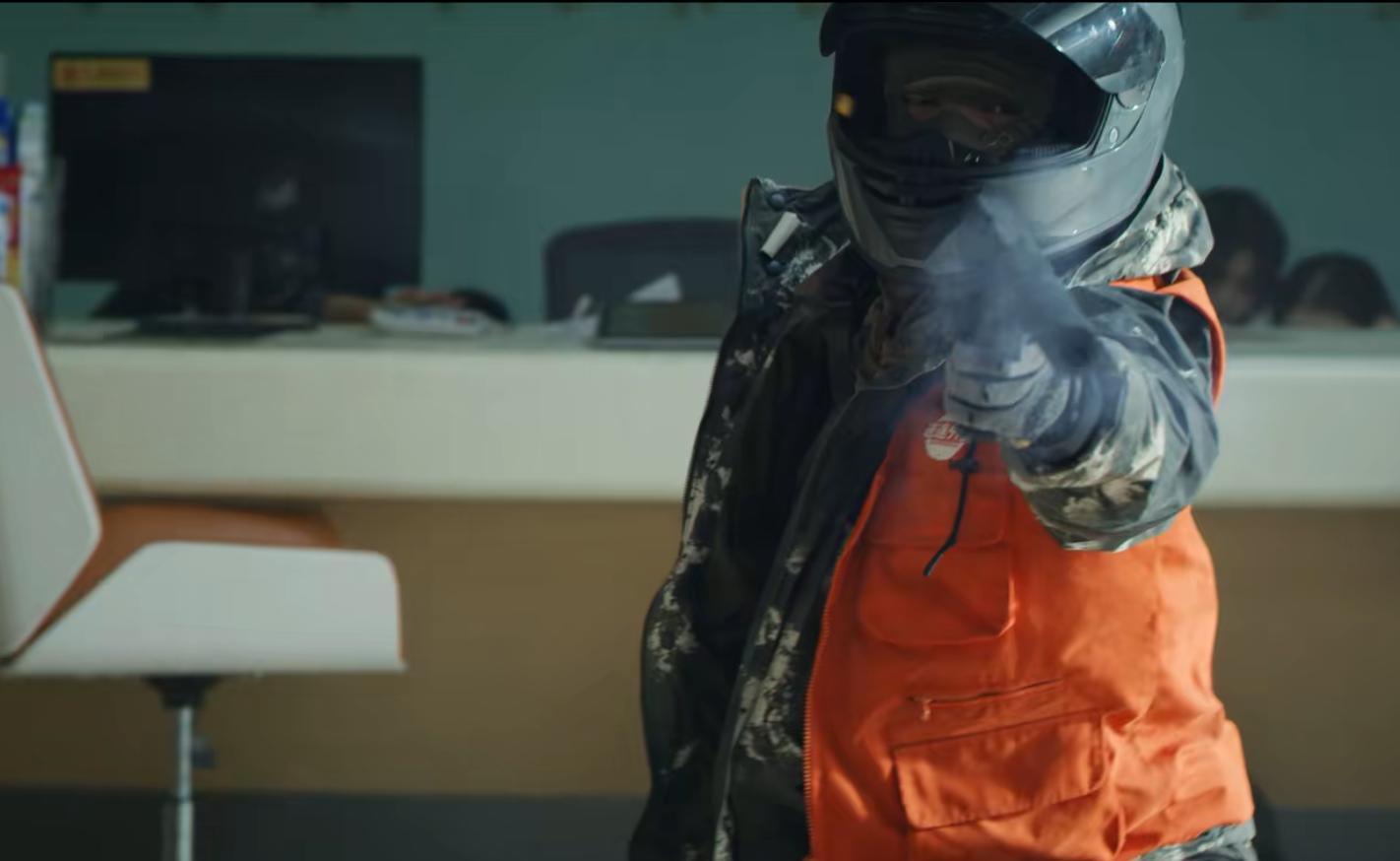 下一秒,蒙面悍匪冲出街道,手持自动步枪与警察展开火拼。