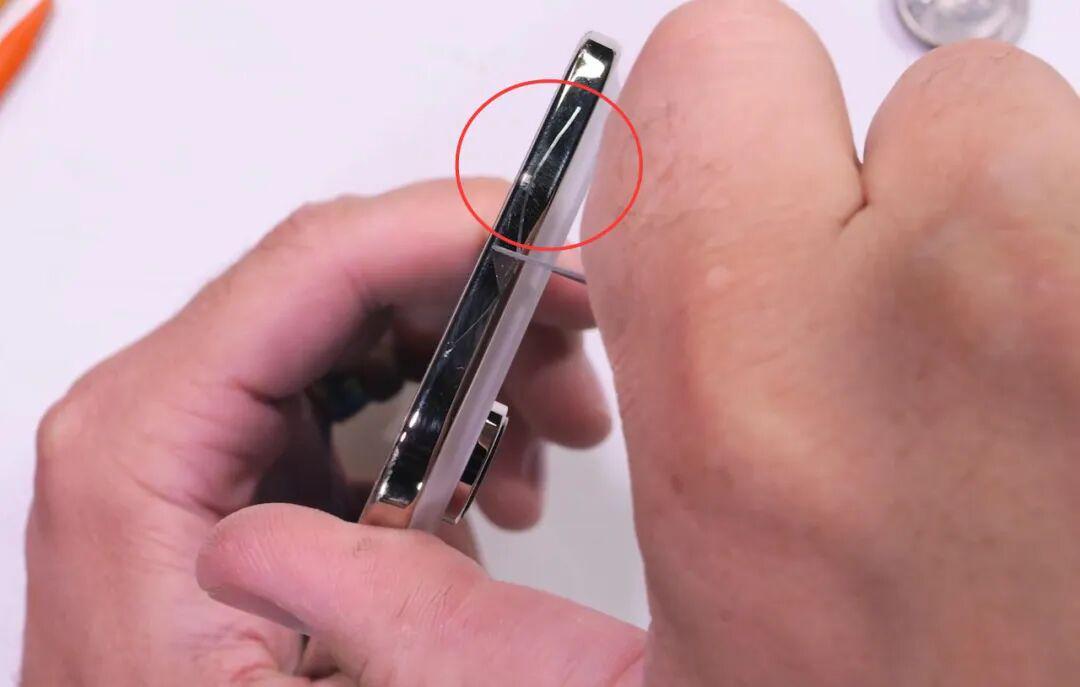 钛金属中框的测试堪称暴力美学:刀刃直接刮擦仅留下浅痕,需用刀尖施压才能造成可见损伤。这种材质通常用于航天器制造,其抗弯折强度是铝合金的2.3倍。当博主尝试徒手掰弯5.6mm超薄机身时,iPhone Air展现出惊人的弹性恢复能力,弯曲后自动复原的特性让测试者直呼不可思议。