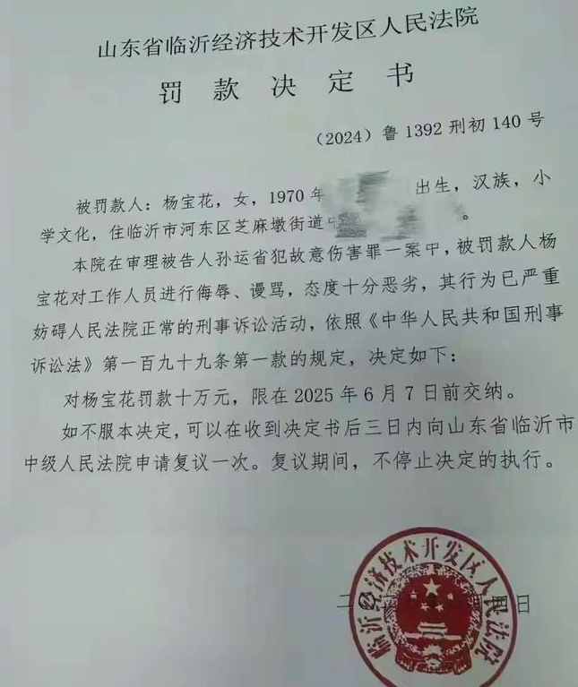 2025年9月,山东临沂农妇杨宝花在法院领取丈夫被殴打案的判决书后,因对判决结果不满,在法院大厅对主审法官于焕琴脱口而出“没有良心”。随后,于焕琴法官以“扰乱司法秩序”为由,对杨宝花作出罚款10万元、拘留15日的处罚决定。这一处罚结果经网络传播后,立即引发轩然大波,网友纷纷质疑处罚是否过重。