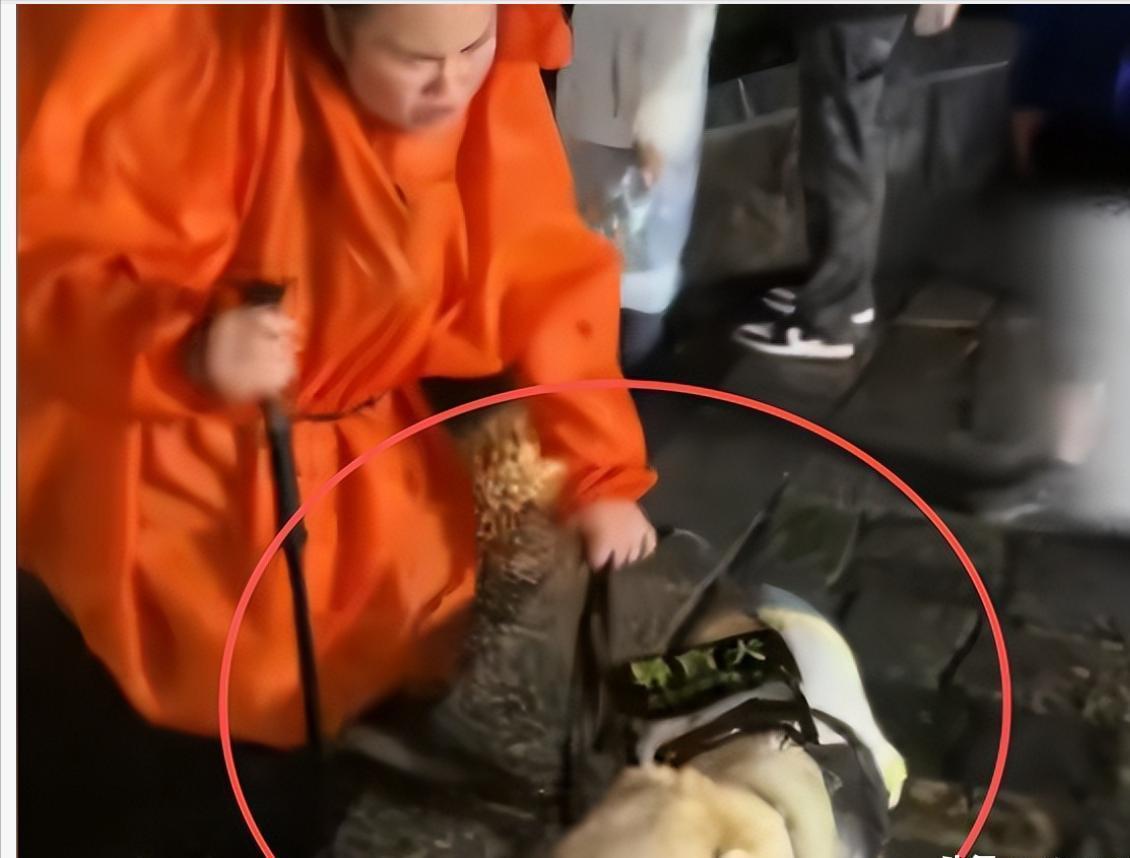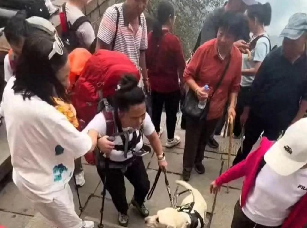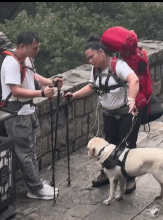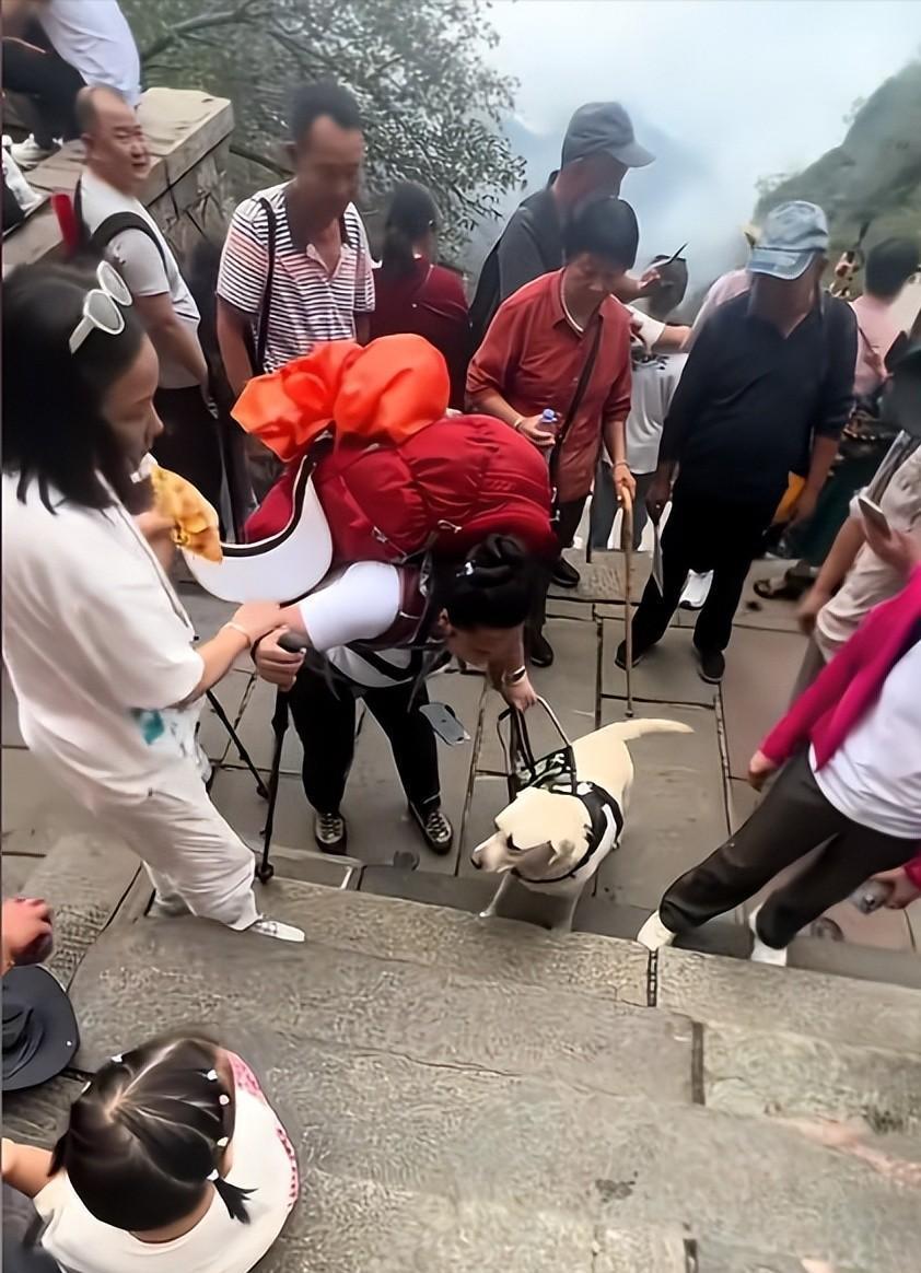 盲人夫妇带着导盲犬冒雨去爬泰山,