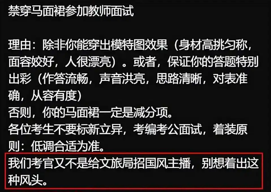 一名备考教师编的女同学就经历了这样的遭遇,这位女生为了在面试中展现自己的文化情怀和独特气质,特意穿了一条颇具中国传统元素的马面裙,她原本期待这样的装扮能让自己在众多考生中脱颖而出,最终顺利高分上岸教师编。