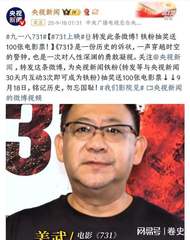 幸运的是,外界的那些负面舆论并没有影响该片的成功上映。该片一经上映,各大影院的排片率就高达98.9%。为了支持电影《731》,央视新闻更是在微博发布了转发抽奖100张电影票的动态,足见其重视程度。