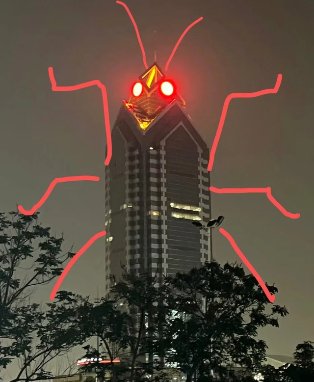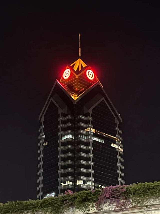 不过,最让人印象深刻的始终是它入夜后那略显幽默的‘蟑螂’造型——两盏红灯自塔楼两侧亮起,勾勒出蟑螂般的轮廓,成为许多人对番禺夜景的独特记忆。尽管早年中国银行方面曾解释说这是现代美学的体现,但并不妨碍市民和网友以‘南方大蟑螂总部’的戏称持续喜爱和讨论它。