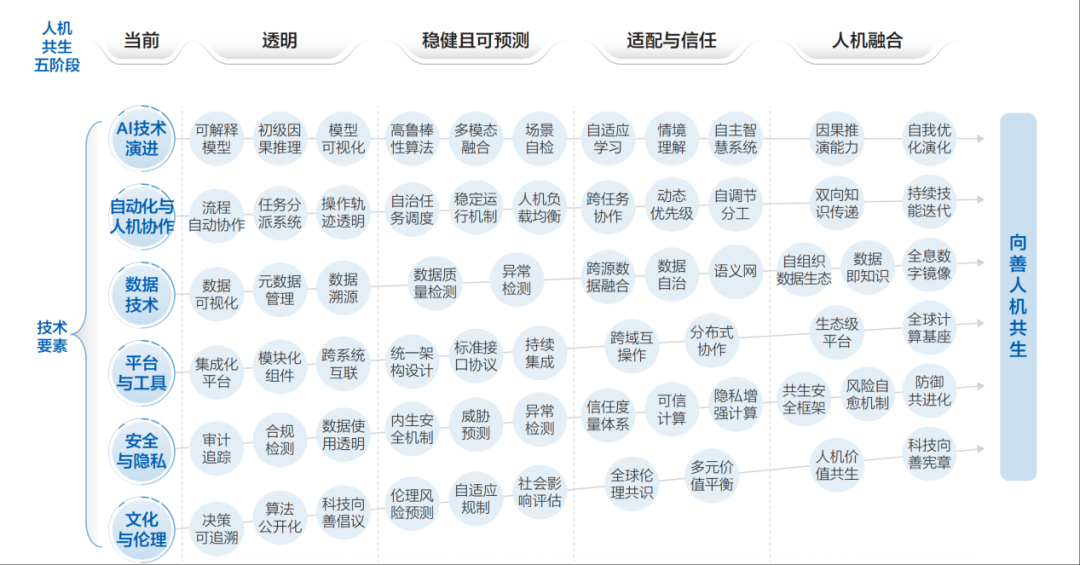 随着AI技术能力的不断增强,其伦理要求进一步升级,必须实现可解释、可追溯、可问责,确保社会能够清晰理解并有效监管AI的决策过程。当AI具备一定自主性后,伦理框架中还需纳入价值对齐与文化包容原则,避免因技术偏见或单一文化输出对多元社会造成冲击。最终,在人机共生的发展模式下,AI需与人类共同构建一套智慧文明体系,并以此作为长远发展的精神内核。