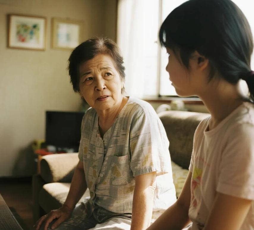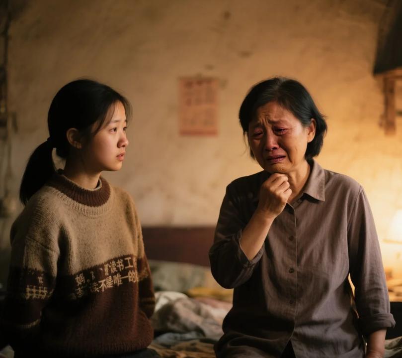 她手里拿着一张折叠得整整齐齐、已经泛黄的旧纸,慢慢走到母亲身边。