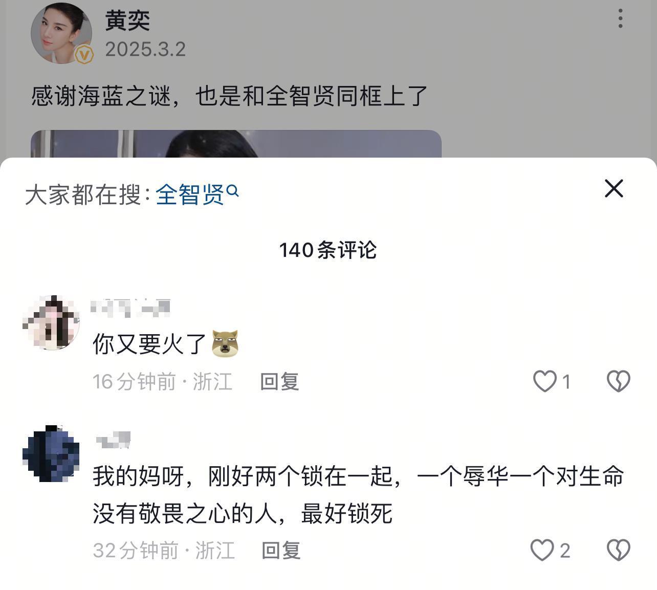 如今不少网友都涌入她的评论区,嘲讽黄奕和全智贤磁场相吸,说她俩一个辱华,一个不敬畏生命。黄奕如今已经紧急下场删评论了,但因为她的视频,多多少少还是被波及到,她自己都没想到只是一个无心之举,却成了身上的又一个黑料。