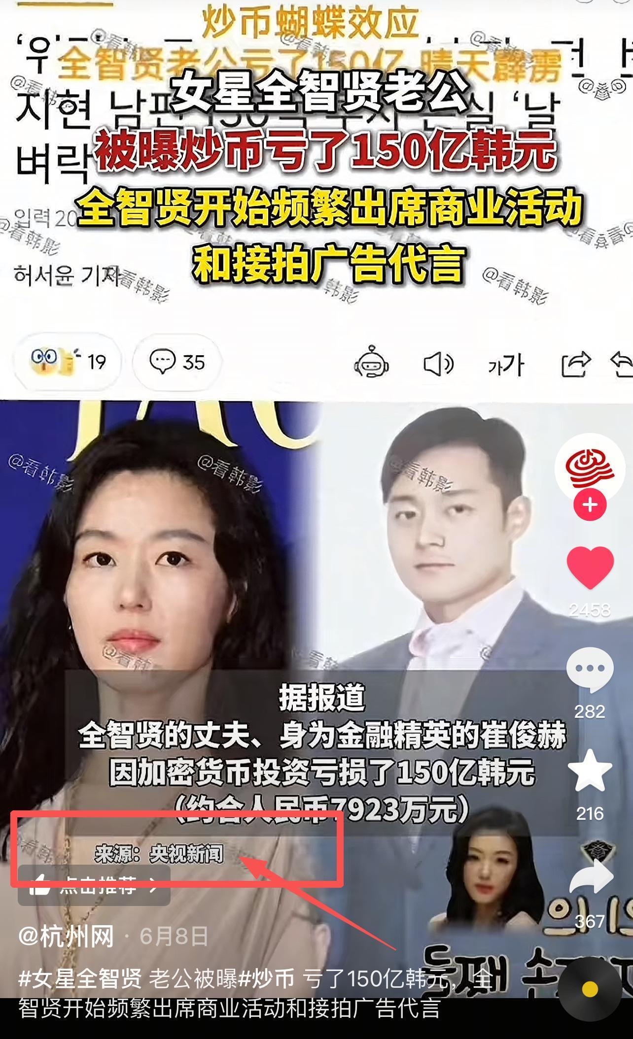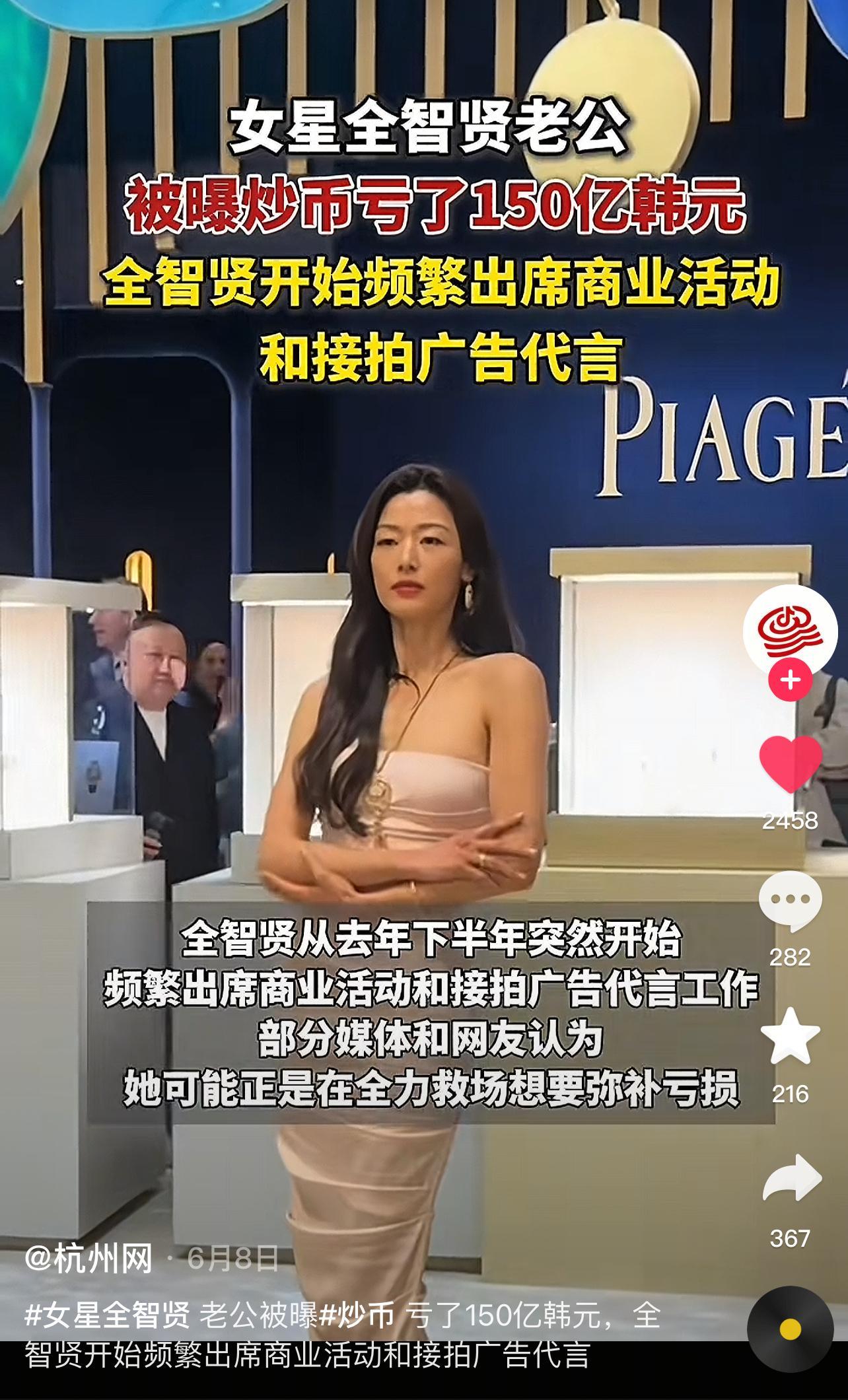 根据报道,她的丈夫因为加密货币的投资失利,直接亏损了150亿韩元,换算成人民币也七千九百多万了。也许正因为数目如此大的亏损,全智贤从去年开始也再也没了富家太太的悠闲,反而不断地接商业活动,拍各种广告代言。
