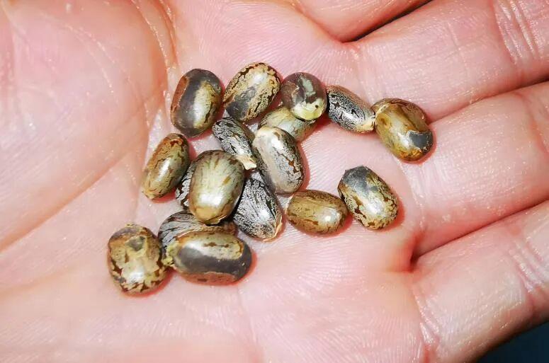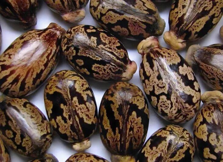 蓖麻的种子极具特色,生长在带刺的蒴果中,成熟后蒴果会裂开,露出3-4颗种子。这些种子形似小核桃,呈黑褐色并带有浅色花纹,表面光滑且硬度高,每颗种子约重0.5克。