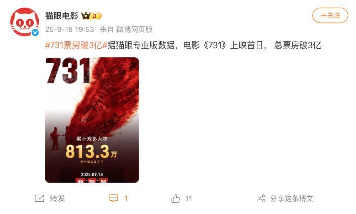 《731》上映仅3天,票房直接突破8亿。