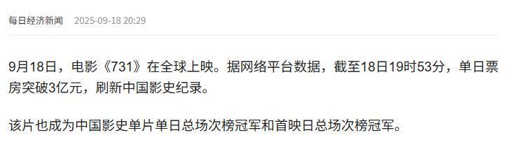 每日经济新闻2025-09-18 单日票房破3亿!电影《731》刷新中国影史纪录!制片方:立即停止传播、下架所有侵权内容