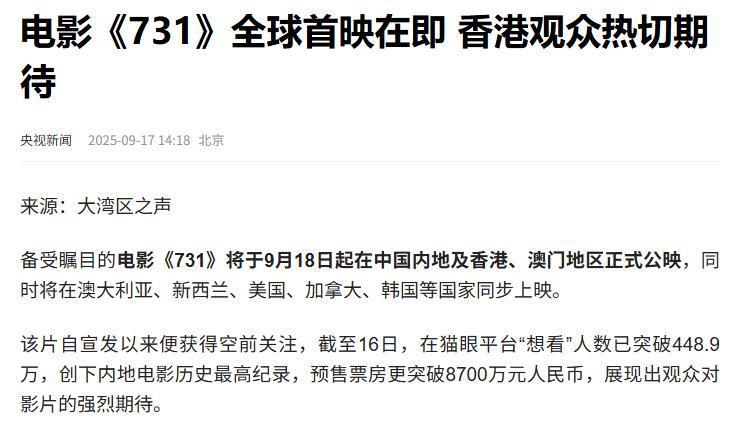 中国新闻网 2025-09-18 电影《731》香港首映 观影市民:“被历史的残酷所震惊”