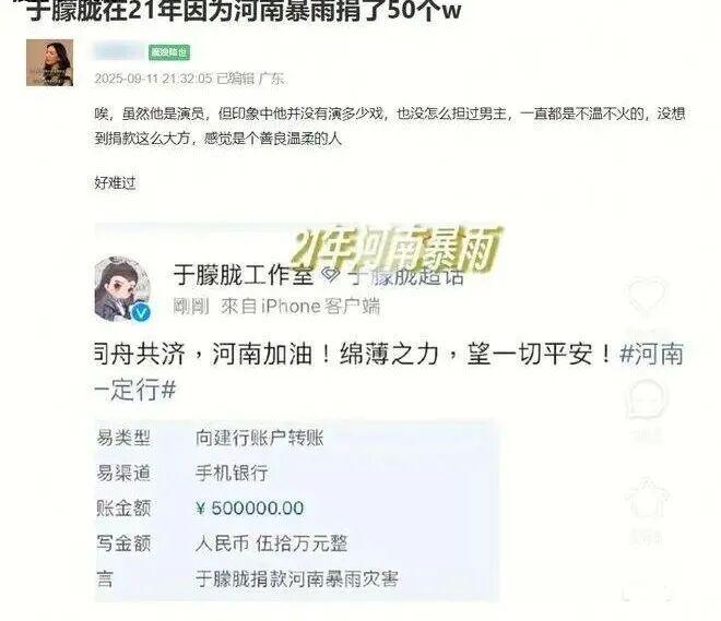 近日,演员于朦胧再次成为网友热议的焦点。他穿着70元的短袖和200多元的棉衣,却慷慨地在河南暴雨灾害中捐出了50万,这一行为赢得了众多非粉丝的力挺。