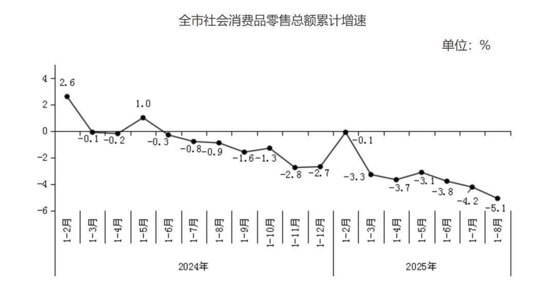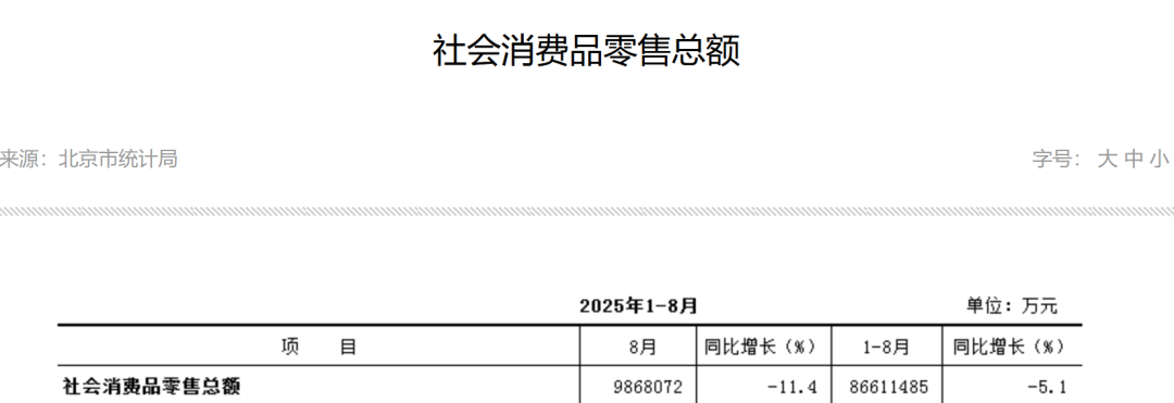 值得注意的是,社零总额的下降并非匀速进行。从月度数据来看,6月当月同比下降7.2%,7月当月同比下降7.3%,而到了8月,同比下降幅度已经扩大至11.4%。这种边际下降速度的加快,无疑让市场对未来消费趋势的担忧进一步加剧。